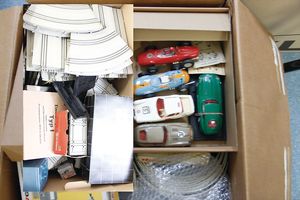 Konv. Stabo Car, 5 Packungen, 4 x Nr. 400, 1 x Nr. 403, 1:32, Autorennbahn, alles bespielt, insgesamt nur 4 Fahrzeuge, mit Gleismaterial, Kart. altersbed. verschlissen