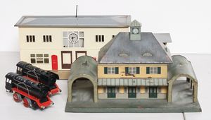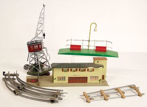 Konv. Fundkiste, Eisenbahn, Märklin, Bahnhof, 50er Jahre, 48 cm breit, 1 Bahnhof Karl Bub, 30er Jahre, 2 kl. Schlepptenderlokomotiven, Spur 0, ,Uhrwerk ohne Tender, einige Leerkartons
