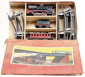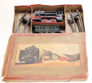 Zugpackung, wohl Distler, Spur 0, Schlepptenderlok B, Uhrwerklok, 2 Personenwagen, Gleismaterial, im Orig.-Kart., bespielt, gut, Kart. altersbed. verschlissen