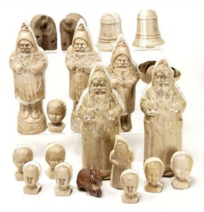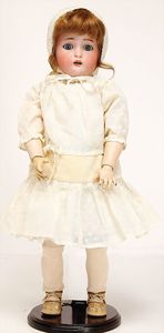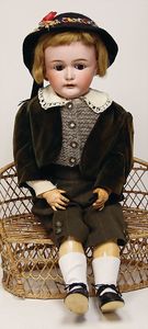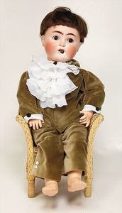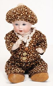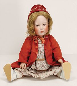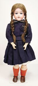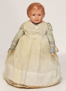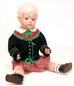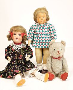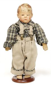 Massekopf-Puppe, gem. 1909, blaue Schlafaugen, off. Mund, Zähne, Kunsthaarperücke, auf Masse-Gliederkörper, mit langen Röhrenoberschenkel, 42 cm, 1 Kramer Holzkopf-Puppe, etwas Farbabrieb an Augen u. Nasenspitze, Stoffkörper, 32 cm, 1 Katze (Gestiefelter Kater), Kunstplüsch, 21 cm