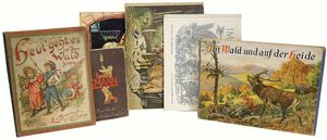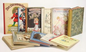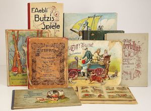 Konv. Kinderbücher, teilw. aus dem Leim gegangen, darunter ,,Struwwelpeter", ,,Butzis Spiele", ,,Pin und die Schatzinsel", ,,Der verlorene Pfennig", ,,Tüff-Tüff Hurrah eine lustige Automobilfahrt", komplett aus dem Leim gegangen, ,,Meggendorfer Blätter", Zeitschrift für Humor u. Kunst, vers. Ausgaben, gebunden