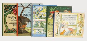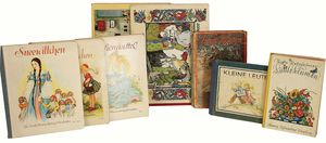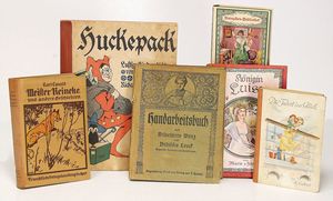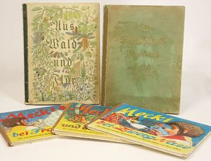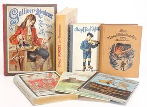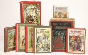 Konv. Kinderbücher, teilw. aus dem Leim gegangen, darunter ,,Groß Illustriertes Märchenbuch", von Idal Ladowitz, ,,Zum guten gelenkt", ,,Zu hoch hinaus", von Käthe Dorn, ,,Der Kinderwundergarten", ,,Die Zwilling", von Dr. G.H. Schubert, ,,Märchen aus 1000 und einer Nacht", Märchen u. Erzählungen, ,,Prinzessin Goldhaar", mit Widmung von 1905, u. andere
