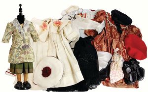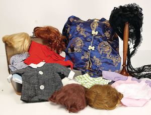 kl. Puppenkoffer, gefüllt mit Puppenkleidung für mittlere Puppen, 1 schwarze Spitzenhaube für gr. Puppe, 6 Echthaarperücken, davon 3x Käthe Kruse