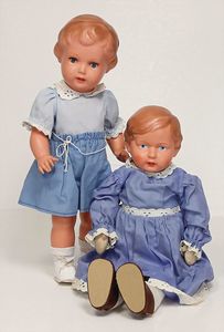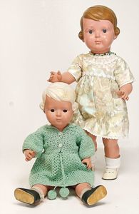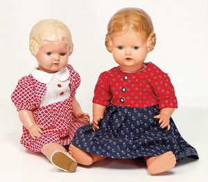 2x Bärbel, 1x braun modellierte Frisur, gem. 49, geklebter Ausbruch an der Halskurbel, 1x blaue Glasaugen, blond modellierte Frisur, Klebereste am Hinterkopf, 45 cm