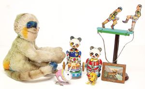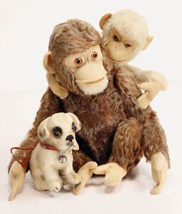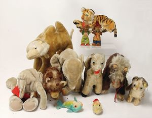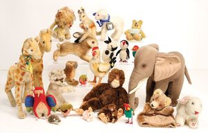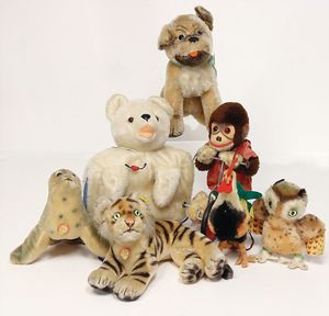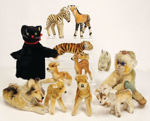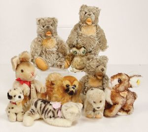 Konv. Plüschtiere, darunter Steiff, Mops mit Knopf u. Fahne, Nr. 3322,0, Tiger liegend, 1 Hahn, 1 Eule, 1 Robbe, alles bespielt, 1 Herrmann Bär (Muff), Affe auf Dreirad, Hersteller unbekannt