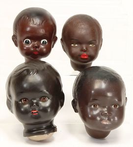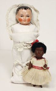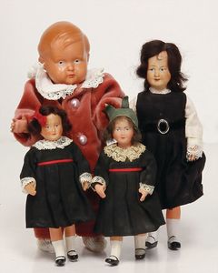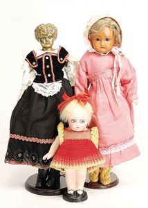 Konv. 3 Puppen, 1x Blech, Brustblattkopf, gem. 3, blaue fest eingesetzte Glasaugen, Stoffkörper, 43 cm, Kleidung aus alten Stoffen nachgenäht, 1x Schildkröt, Celluloid-Brustblattkopf-Puppe, gem. Schildkröte ohne Raute, braune Schlafaugen, off. Mund, Zähne, Echthaarperücke, Riss am Brustblatt, auf Wachstuchkörper, Celluloidunterarme, 43 cm, 1x Papiemaché-Puppe, Wachsüberzogen, Mohairperücke aufgeklebt, gemalte Augen, beweg. Arme (Stehpuppe), 24 cm