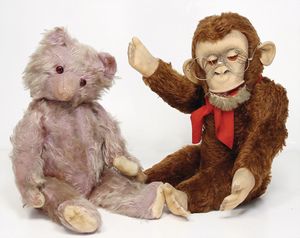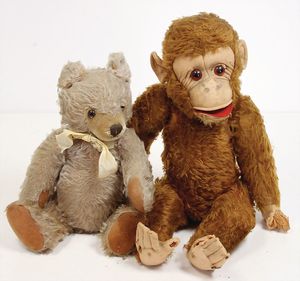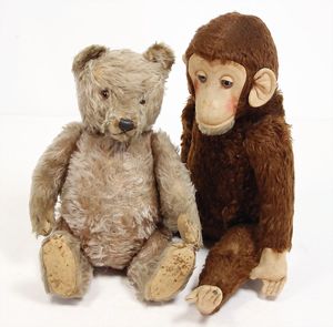 2 Plüschtiere, Hersteller unbekannt, 1x Bär, stark abgeliebt, Fell fliederfarben, 42 cm, 1x Affe mit Glasaugen, 48 cm