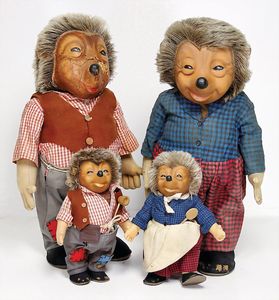4x Mecki, stärker bespielt, 2x davon ca. 50 cm, 1x Mecki, Rissbildung im Gesicht, 1 Teil fehlt, 2x Mecki, ca. 26 cm