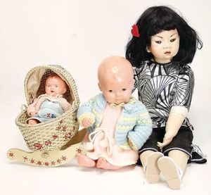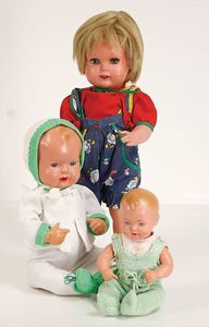 3 Celluloid-Puppen, darunter 2x Schildkröt Strampelchen, gem. 25 u. 35, mit Stimme, 1 Celluloid-Stehpuppe, gem. 44, mit Echthaarperücke, blaue Schlafaugen, off. Mund