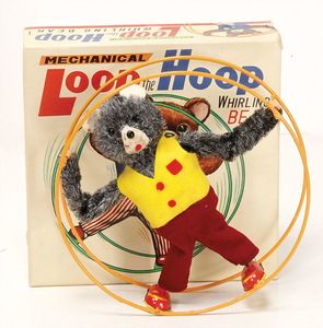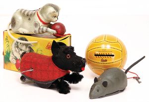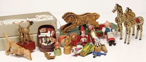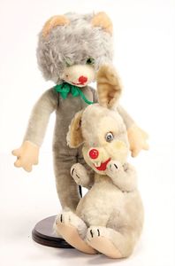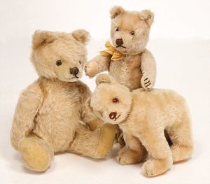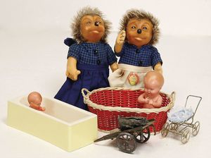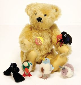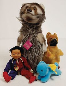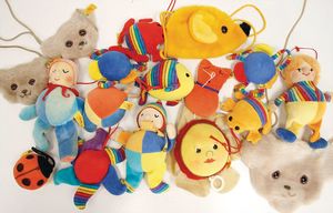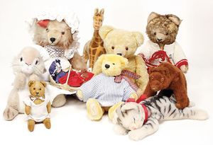 Konv. Babyspielzeug, Samt, weich gestopft, teilw. mit Knopf u. Fahne, meist bespielt, darunter 1 Spieluhr u. 4 Brustbeutel, 3 x Bär mit Knopf, 2 x mit Fahne, kl. Maus