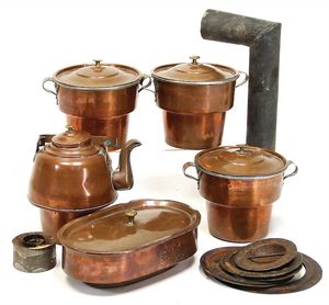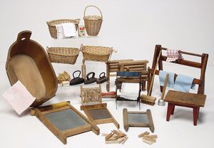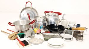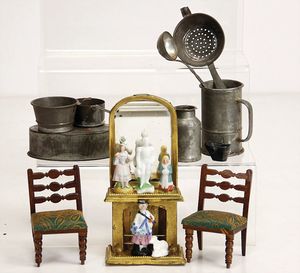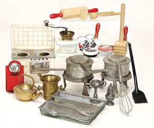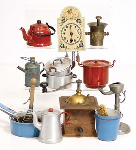 Konv. Puppenküchenzubehör, einige Töpfe, Pfannen, Wasserkessel (Weißblech, Messing u. Blech emailliert), Kaffeemühle, Holz, H: 6,5 cm, 1 Wanduhr in Bauernmalerei, H: 10 cm, 1 Öllampe, Deckel fehlt, u. anderes