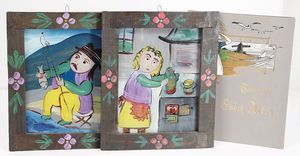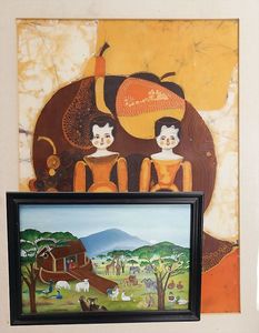 Öl auf Leinwand, Arche Noah, gerahmt, von 1983, 53,5x34,5 cm, dazu 1 gerahmte Batik von Anne Löhr, gerahmt im Paspartout, 32 x 32,5 cm
