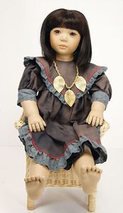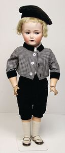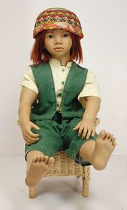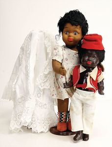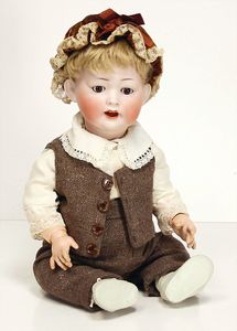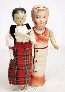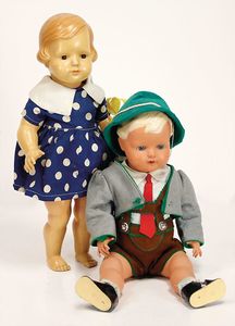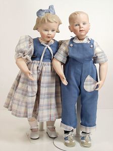 Puppenpaar, Paul u. Polly, Porzellan von Jayne Elliott USA, Auflage 1959, 2 von 6, Porzellan-Kurbelkopf, mit Brustblatt, schön ausmodellierte Gesichtszüge, Mädchen, modellierte Schleife, gemalte Augen, off./geschl. Mund, Stoffkörper, Porzellanarme- u. Unterschenkel, 58 cm, beide Orig.-Kleidung, guter Zust.