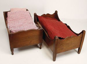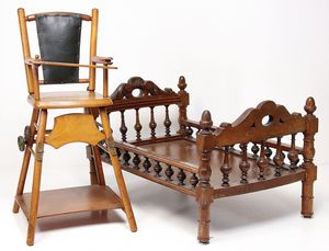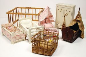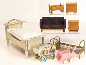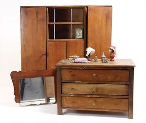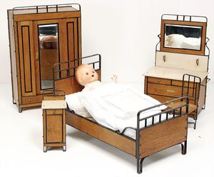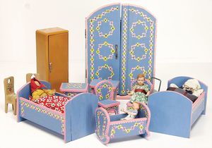 Puppenschlafzimmer-Mobiliar, Holzkleiderschrank, H: 35 cm, Bett, 38 cm, Spiegelkommode, Nachtschrank, 1x Masse-Baby (Strampelbaby), Uhrwerk intakt, 42 cm