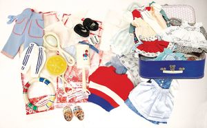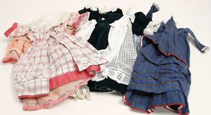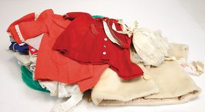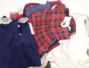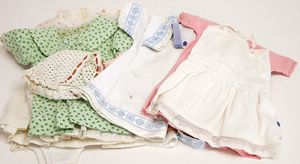 Konv. Puppenkleidung, für mittlere Puppen, alt, darunter auch Weißwäsche, Kleider u. mehr, bitte besichtigen