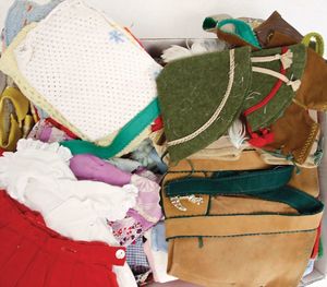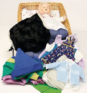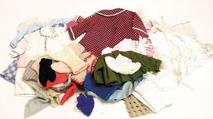 gr. Konv. Puppenkleidung, f. kl. u. mittlere Puppen, darunter auch Trachtenkleidung, Lederhosen u. Hüte, 1 x Babykleidung, Strampler, handgearbeitete Jäckchen u. Hosen, bitte besichtigen