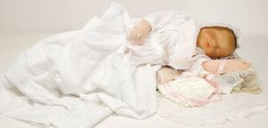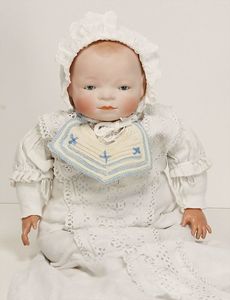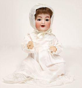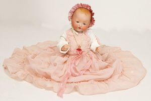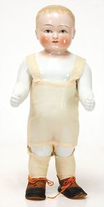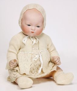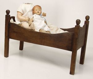 Masse-Sitzbabykörper, ca. 35 cm, 1 Keramik-Einbindekopfpuppe, gemalte Augen, off. Mund, 2 Zähne, ausmodellierte Frisur, auf einfachem Stoffkörper, 33 cm, in 1 Puppenbett, Holz, L: 60 cm