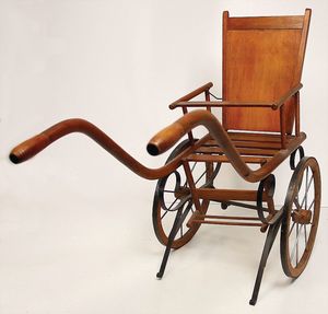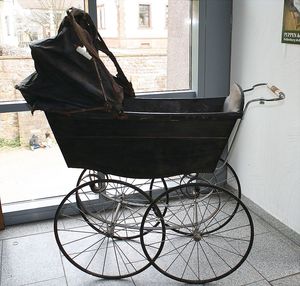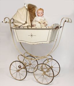 Kinderwagen, Speichenräder, Wachstuchverdeck, Griffstange Holz, stark bespielt, H: 90 cm, L: ca. 1,16 m