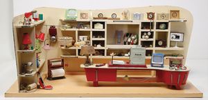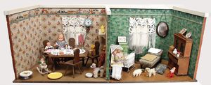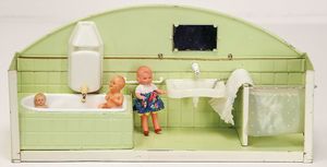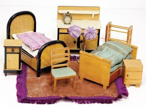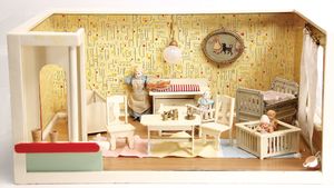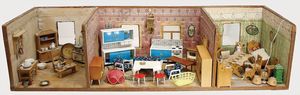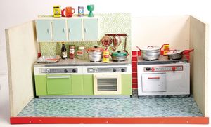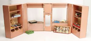 3-tlg. Puppenstube, 1,15 m breit, 36,5 cm tief, 2 Durchgangstüren, teilmöbliert, mit Zubehörteilen, Schlafzimmer, Küche, 1 Möbelprogramm im Orig.-Kart., 60er Jahre