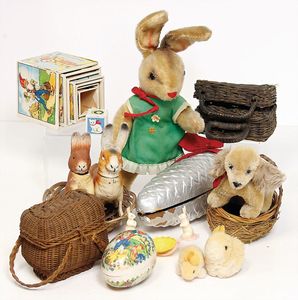 Fundkiste f. Händler, Käthe Kruse, Kathl, blond, neuer, neuwertig, Orig.-Kart., 8 Ostereier, Stofftiere, Sammlerhasenpaar, etc.