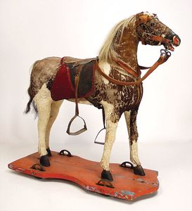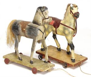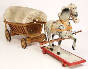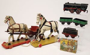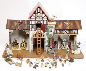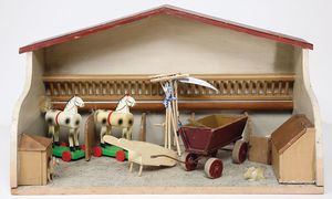 Stall, wohl Eigenbau, Länge 59 cm, Tiefe 33 cm, Höhe 34 cm, mit 2 Holzpferden auf Rädern, mit 1 Anhänger, Holz, einige Werkzeuge wir Sense, Mistgabel, u. anderes