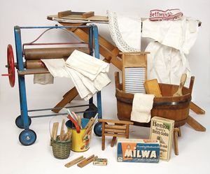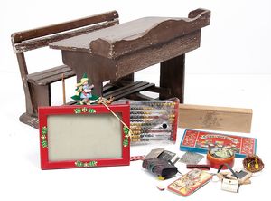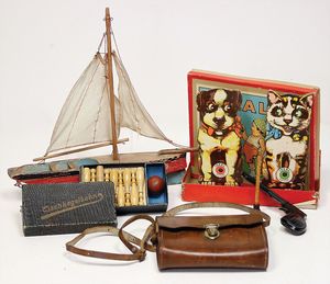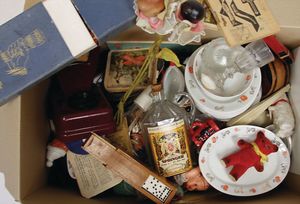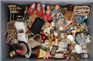 1 Kart. Zubehör, Porzellan, Glas, einige Spiele, Puppenstubenpuppen, 1920 – 1960