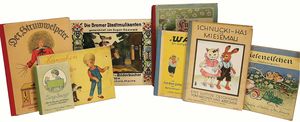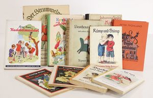 Konv. Kinder- u. Jugendbücher, „Gritlis Kinder“ von Johanna Spyri, „Kuddelmuddel“ von Käthe Kruse, „Rump und Stump“ von Karl Friedrich Oswald, „Lieschens Streiche“ von Agnes Sapper, „Lustige Bilder (von der Liebe und im Wüstesand“, Verlag Braun & Schneider, „Struwwelpeter“, u. andere