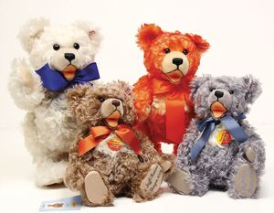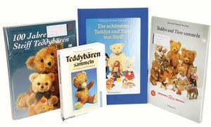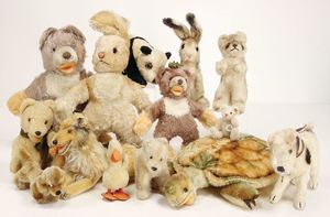 Konv. 15 Plüschtiere, meist Steiff, bespielt, 2 Wurfbären mit Knopf, kl. Steiff Club Bär 2001, Collie liegend, mit Schild, u. anderes, darunter auch Hermann Teddy auf 4 Pfoten
