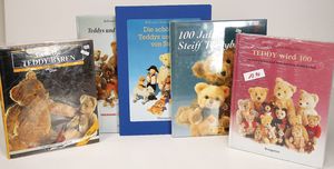 Konv. 5 Club Zinnminiaturen (Ente u. Teddy), 3 Anstecknadeln, 2 Steiff Armbanduhren, einige Steiff Kataloge, Nachdrucke 1949 – 53, einige Steiff Postkarten, neuer