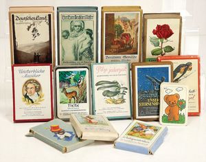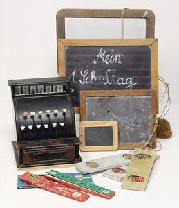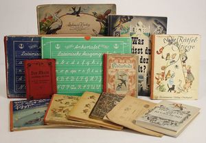 Konv. Kinder- u. Schulbücher, „Kinderfibel“ von 1952, „Was weißt du von der Welt“ von Birkel Nudel mit Klebebildchen, „Die Rätselstiege“ von Paula Walendy, „Das Glück ist kugelrund, Denk- und Weisheitssprüche“, 2 alte Schultafel im Schuber, „Kinderfreude“, u. anderes
