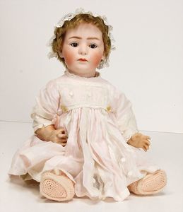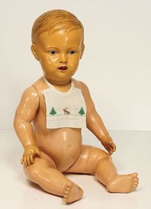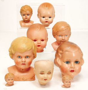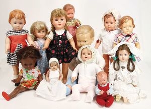 Händlerkonv. Celluloid- u. Vinyl-Puppen, meist Schildkröt, Ursel, gem. 41, Storch, gem 53, Schildkröt Einbindekopf-Baby, gem. 45, Stoffkörper, Schildkröt Bebi, Kopf gem. 60, Cellba Mädchen gem. 46/45, Schildkröt Celluloid-Brustblattkopf-Puppe, fest aufgeklebte Echthaarperücke, Rissstelle über der Nase, einige kl. Stellen ausgebessert am linken Augen, Bruno Schmidt Baby, gem. 25, blaue Schlafaugen, Echthaarperücke, u. anderes