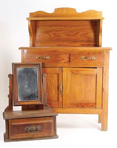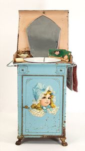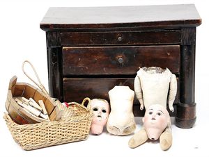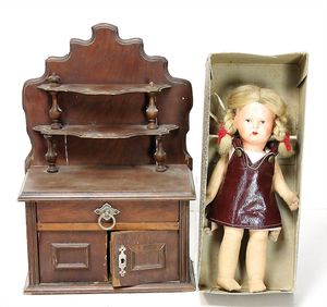 Kurbelkopf, Masse, Stoffkörper, im Orig.-Kart., wohl 30er Jahre, 1 Puppenschrank, ca. 1920, 37 cm hoch