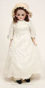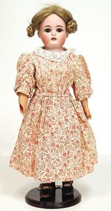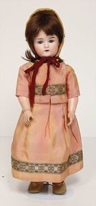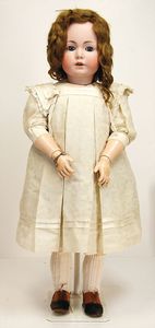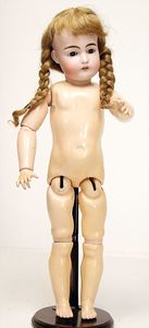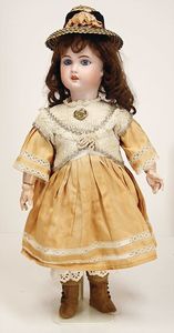Celluloid-Brustblattkopf-Puppe, gem. Schildkröte in Raute Nr. 14, braune Schlafaugen, off. Mund, Zähne, kl. Riss am linken Augenwinkel, Echthaarperücke, auf Lederkörper, Celluloidunterarme, 52 cm