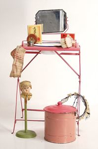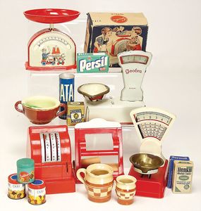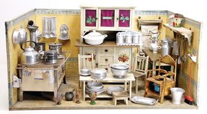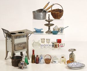 schönes Händlerkonv., Puppenküchenteile, Porzellan, Blech, Korb, 1 Herd, 1 Etagere vernickelt