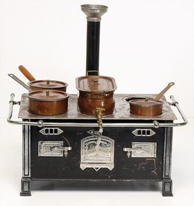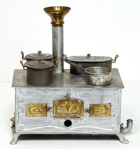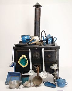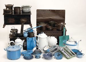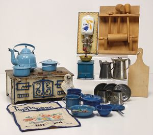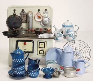 Konv. Puppen-Kaffeeservice, Blech emailliert, blaue Kanne, mit 4 Tassen, 3 Untertassen, Zuckerschale u. Milchkännchen, hellblaue Kaffeekanne u. Milchkännchen, 1 x Service mit Blumenmotiv, nicht komplett, 1 kl. Puppenherd, Blech, 13 cm hoch, 19 cm breit, mit einigen kl. Töpfen u. Zubehör, 1 Kuchengitter