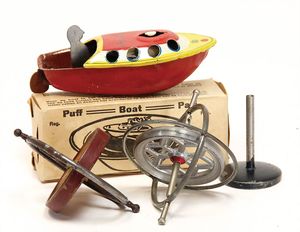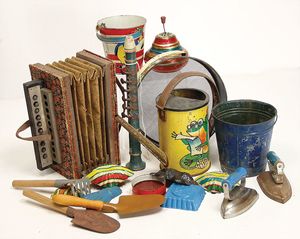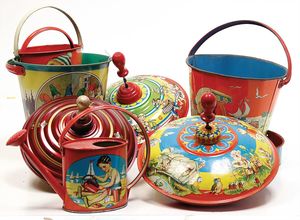 Kinderspielzeug, Blech lithogr., 3 kl. Sandeimer, 18 cm, mit Sieb, 1 Gießkännchen, einige Sandformen, dazu 3 Blechkreisel, 1 x defekt, 1 x Aufschrift Bing