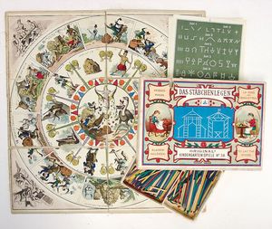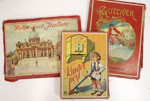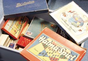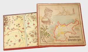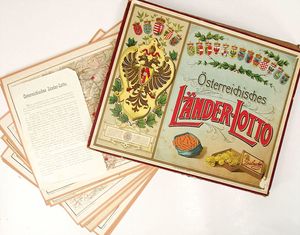 Deutschland Geographie Lotto, ca. 1915, mehrteiliges Brettspiel, mit Spielsteinen, auf Vollständigkeit nicht geprüft, wohl weitgehend komplett, im Orig.-Kart., mit lithogr. Deckbild