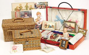 Fundkiste, kl. Badepuppe, blond, 1 Fußspitze bestoßen, Porzellan, Holzteile, Stickmuster, Hüte, Taschen, etc.