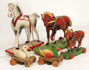 Konv. Celluloid, Stifthalter, Ente, 10,5 cm, kl. Kinderwagen, 1 Rad ergänzt, einige kl. Celluloidpuppen, mit Fehlern, 1 Biskuitpuppe im Ei