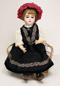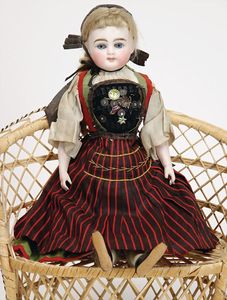 Wachsbrustblattkopf-Puppe, blaue fest eingesetzte Glasaugen, eingesetztes Echthaar, Wachs an mehreren Stellen gerissen u. zusammengefügt, Gliederkörper, Porzellanunterarme, 37 cm, dazu 1 Korbliege, 70 cm