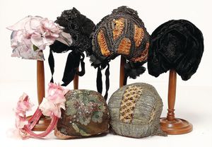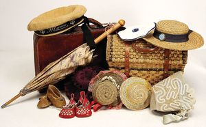 Konv. Puppenschuhe, versch. Gr. u. Materialien, darunter 1x Rollschuhe, 1 Kunsthaarperücke, 1 Kinderhaube (Tracht)