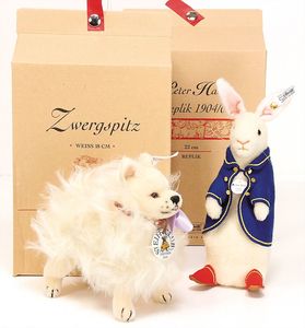 Konv. Plüschtiere, bespielt, darunter 3 x Zotty, 21 cm, 1 Zotty mit Knopf, 2 Hasen, 1 x Hermann, Schlafkatze, Eisbär, kl. Eule, Dalmatiner, alles ohne Knopf, Schild u. Fahne, kl. Pekinese Peky, mit Knopf, Schild u. Fahne