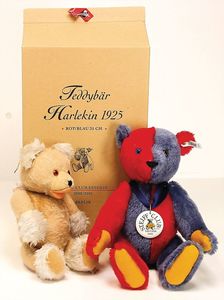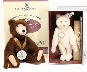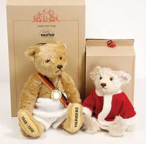 2 Bären, 1 x Teddybär Herbert, exklusiv für Galleria Kaufhof, 45 cm, 1 x Weihnachtsbär, mit Spieluhr, Uhrwerk intakt, 30 cm