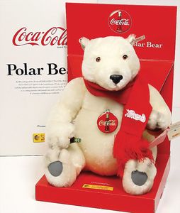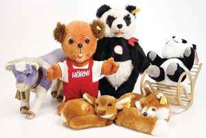 Konv. 5 Steiff Plüschtiere, darunter Bambi u. Xorry, weich gestopft, 1 x Pandabär, Replika von 1938, mit Knopf, Schild u. Fahne, 35 cm, 1 x Hörni, Werbefigur, mit Knopf u. Fahne, Nr. 7832/32, mit 1 Holz-Schaukelstuhl, 1 Milka Kuh, Knopf, Schild u. Fahne fehlen, Länge ca. 30 cm, 1 WWF Bär, weich gestopft, ca. 22 cm