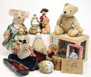 schönes Händlerkonv., Steiff Tiere, 50er/60er Jahre, Puppenkleidung, Stofftiere andere Hersteller, etc., 1 Kart., bitte besichtigen