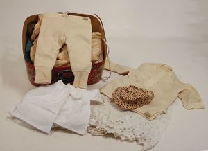 Konv. Weißwäsche bzw. Kleidung f. mittlere u. größere Puppen, auch in Kindergöße, teilw. mit schönen Baumwollborten