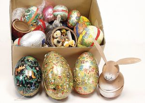 Konv. Ostern, Ostereier, Presspappe, bunt lithogr., Osterhase Candy Container, einige Wollküken, Ostereier Holz