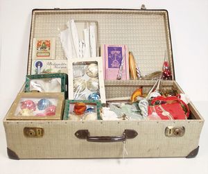 1 Koffer gefüllt mit Christbaumschmuck, Spiegelglas, Milchglas, Papier, 1 Engelsgeläut, meist neuer, bitte besichtigen