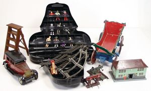 Fundkiste f. Händler, Star Wars Figur, Kopf Darth Vader, Leiterwagen, ca. 1910, Fehlstellen, einige Gleismaterialteile, 1 Limousine, Blech, stark bespielt