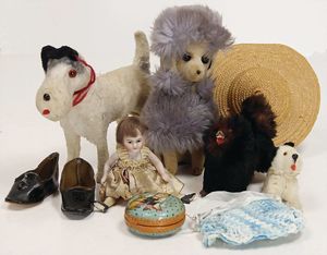kl. Ganzbiskuitpuppe, 13 cm, Fellhund, 9,5 cm, 1 Hund später, ein paar Puppenschuhe, Hut